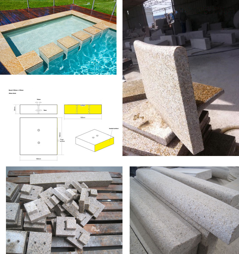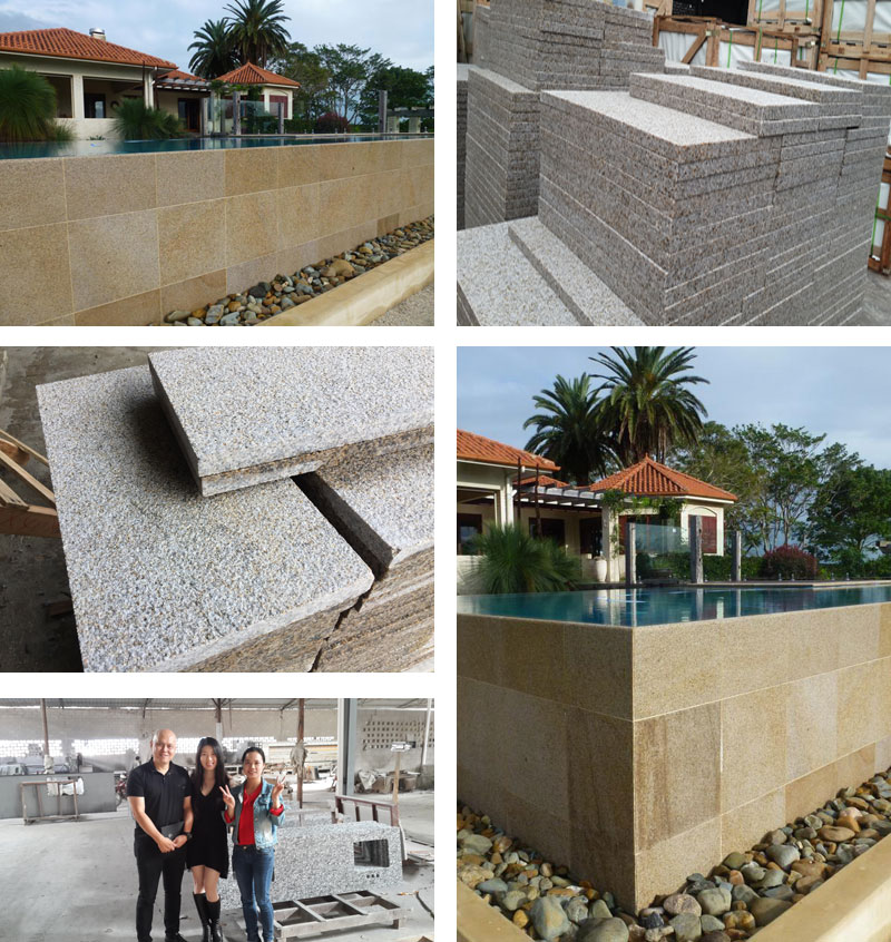 We get the inquiry from alibaba.com and sent the granite sample pieces by DHL to customer's office. Then the clients visit our factory and confirm the order details such as color, finish,size, order quantity, etc. We also help client to source the beautiful mosaic pool tiles and ship together in full containers. Customer love these tiles for the poolside and mosaic tiles.
