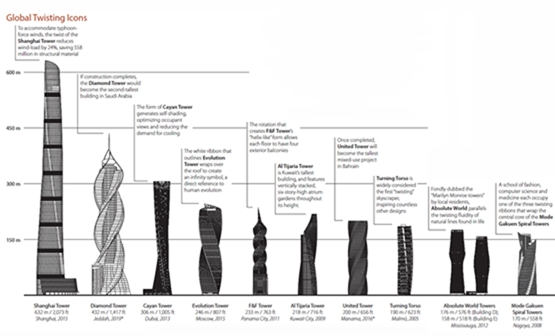 A map of the latest industrial studies of distorted architecture in the world reveals that "twisting skyscrapers" is more popular than ever before. Of these "twisted skyscrapers," the tallest is the 632-meter Shanghai Tower. It is currently the second tallest building in the world.